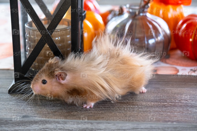 Забавный лохматый пушистый хомяк в Хэллоуин и осенний декор среди тыкв, желтые листья на столе. Фестиваль урожая