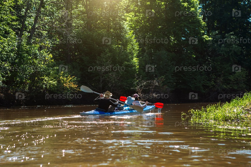 Мужчина и женщина пара в семейном байдарочном путешествии на гребном катере по реке, водный поход, летнее приключение. Экологичный и экстремальный туризм, активный и здоровый образ жизни
