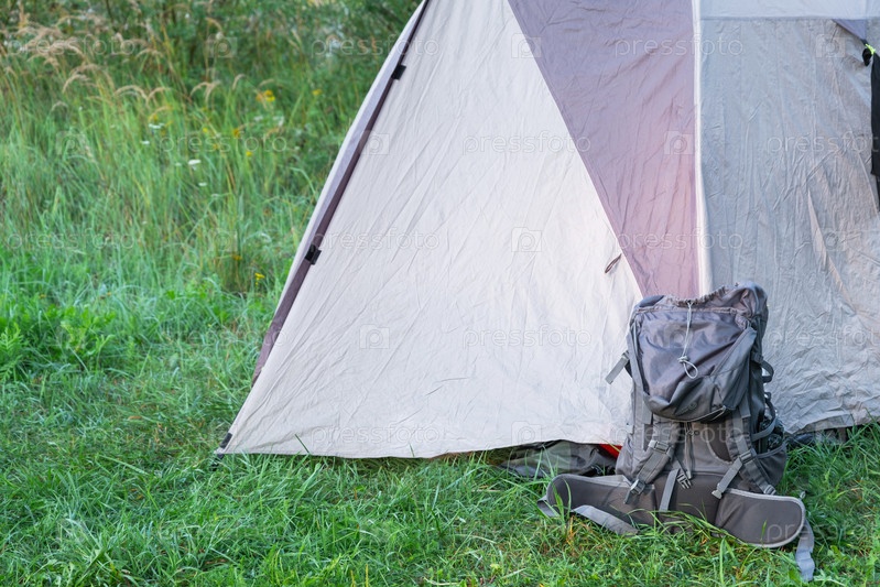 Установлена туристическая палатка И рюкзак в кемпинге на природе в лесу. Внутренний туризм, активные летние каникулы, семейные приключения. Экотуризм, спорт, поход. Копировать пространство, высмеивать