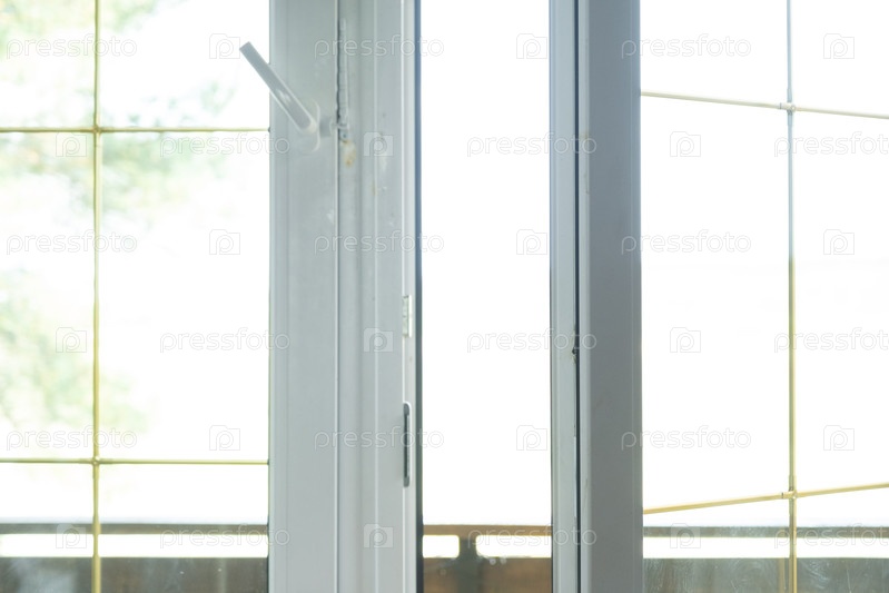 Оконный чердак изнутри дома пластиковое стекло с двойным остеклением, чистое стекло после чистки окон, открытое и закрытое окно, оконная фурнитура