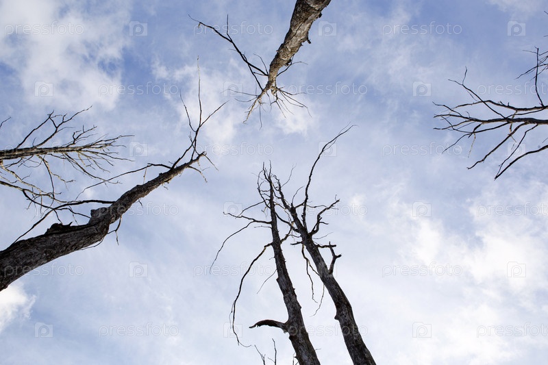 Сухие стволы с дрейфующей древесиной и ветвями деревьев стремятся к небу. Голубое небо – символ жизни и мертвых деревьев. Естественный фон, ужас, жизнь и смерть