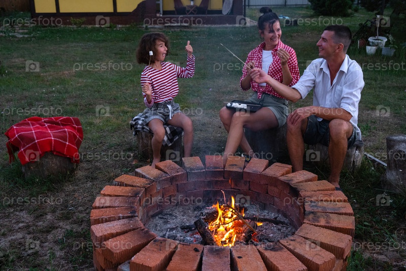 Семья мама, папа, дочь жарят зефир на шашлыках на костре в очаге во дворе дома у пожарной ямы уютным летним вечером