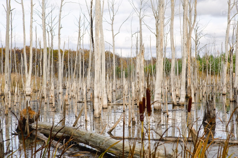 Болото с сухими мертвыми деревьями, бревнами и цветущими хвостами. Экологические проблемы, заболачивание территории, необитаемые районы. Естественный фон