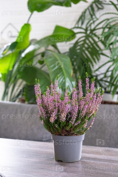 Цветущий вереск в горшке на столе в интерьере дома. Весеннее время, подготовка к посадке в открытом грунте, саженец для клумбы, цветочное хобби, комнатное растение