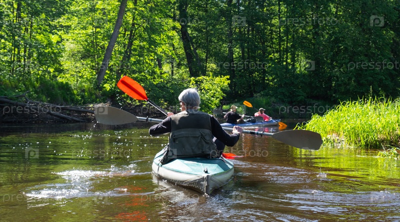 Групповая поездка на байдарках для сеньора и сеньоры. Пожилая пара и взрослая гребная лодка на реке, поход по воде, летнее приключение. Возрастные виды спорта, умственная молодость и здоровье, туризм, активная старость