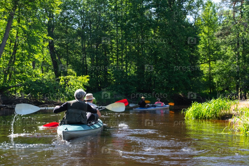 Групповая поездка на байдарках для сеньора и сеньоры. Пожилая пара и взрослая гребная лодка на реке, поход по воде, летнее приключение. Возрастные виды спорта, умственная молодость и здоровье, туризм, активная старость