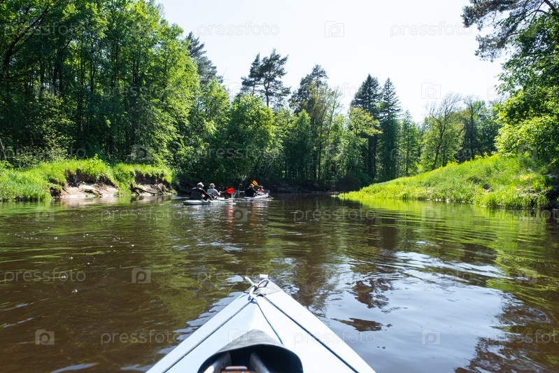 Групповая поездка на байдарках для сеньора и сеньоры. Пожилая пара и взрослая гребная лодка на реке, поход по воде, летнее приключение. Возрастные виды спорта, умственная молодость и здоровье, туризм, активная старость