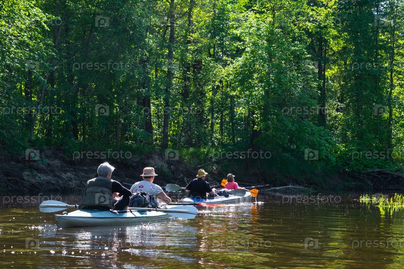 Групповая поездка на байдарках для сеньора и сеньоры. Пожилая пара и взрослая гребная лодка на реке, поход по воде, летнее приключение. Возрастные виды спорта, умственная молодость и здоровье, туризм, активная старость