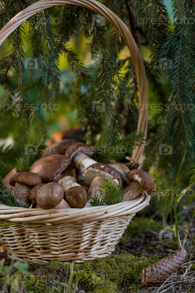 Благородный королевский гриб. Темно-белый или бронзовый болет. Болетус грибы в плетеной корзине в ельном лесу. Красивая текстура природного фона
