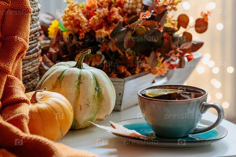 Натюрморт. Одеяло, тыквы и чашка чая на кофейном столике в домашнем интерьере гостиной. Уютная осенняя концепция