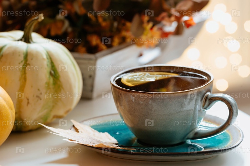 Натюрморт. Одеяло, тыквы и чашка чая на кофейном столике в домашнем интерьере гостиной. Уютная осенняя концепция
