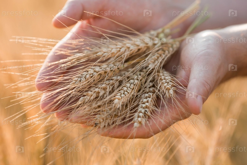 Человек держит золотые уши пшеницы на фоне созревающего поля. Руки фермера крупным планом. Концепция посадки и сбора богатого урожая. Сельский пейзаж на закате