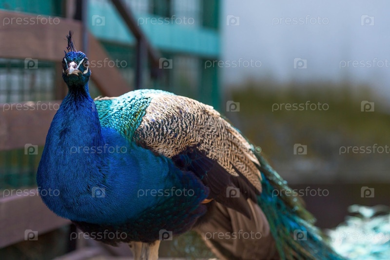 Портрет красивого индийского или голубого павлина с перьями. Красивый птичий хвост. Красивый представительный экземпляр самца в великолепных металлических цветах
