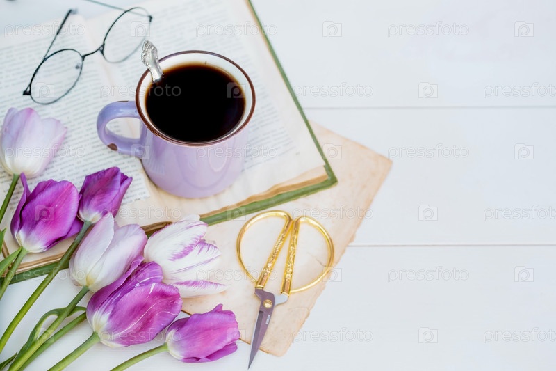 Натюрморт в винтажном стиле. Причудливая фиолетовая кофейная кружка, старая книга, тюльпаны и стаканы на деревянном столе