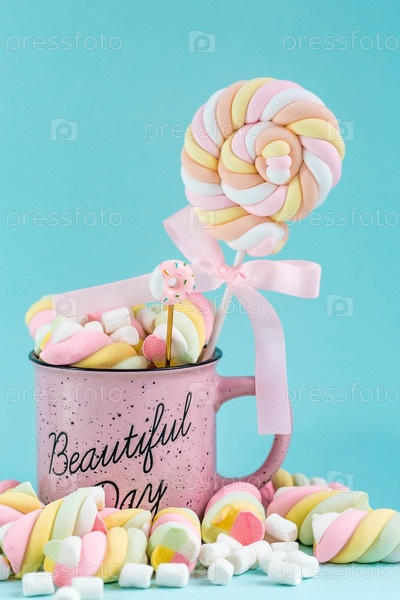 Маршаллоу. Сухой конфетный крупный план на бирюзовом фоне. Десерт сладкой еды в чашке с горячим шоколадом. Пастельные цвета. Копия текстового пространства