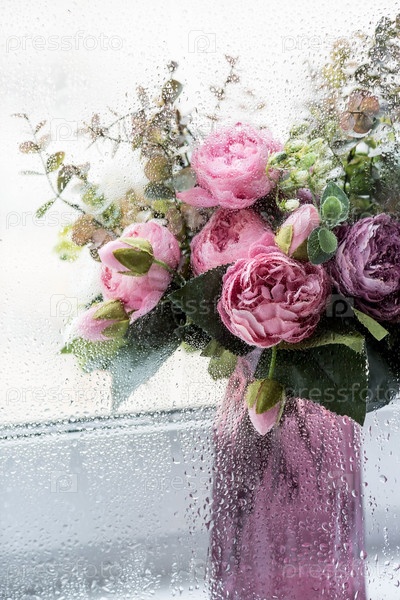 Свежий натюрморт. Ваза цветов за окном. Вода падает после дождя на стекло. Букет роз и эвкалипта. Красивая весенняя поздравительная открытка
