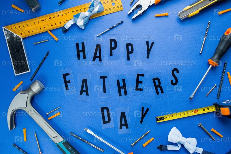 Модный синий фон с инструментами и световой коробкой с надписью: «С днем отца». Дай мне подарок. Концепция счастливого папиного дня
