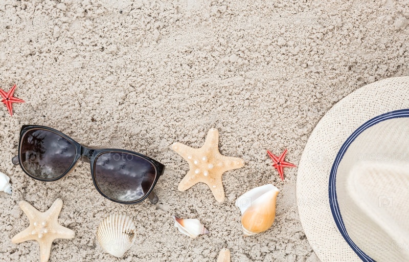 Концепция отдыха на море. Снаряды, соломенная шляпа, солнцезащитные очки на песке. Предыстория летних каникул с пространством для текста. Вид сверху