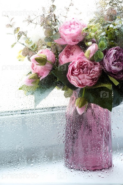 Свежий натюрморт. Ваза цветов за окном. Вода падает после дождя на стекло. Букет роз и эвкалипта. Красивая весенняя поздравительная открытка