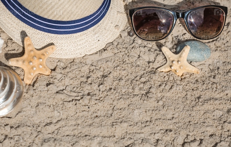 Концепция отдыха на море. Снаряды, соломенная шляпа, солнцезащитные очки на песке. Предыстория летних каникул с пространством для текста. Вид сверху