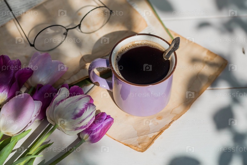 Натюрморт в винтажном стиле. Причудливая фиолетовая кофейная кружка, старая книга, тюльпаны и стаканы на деревянном столе