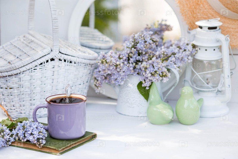 Открытка очень красивая. Причудливая фиолетовая кофейная кружка, старая книга и букет фиолетового сирени. Прекрасная натюрморт. Весеннее время. Концепция «Доброе утро»