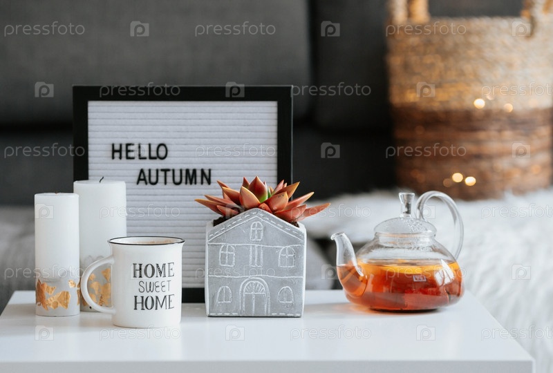 Натюрморт. Одеяло, чайник и чашка чая на кофейном столике в домашнем интерьере гостиной. Уютная осенняя концепция