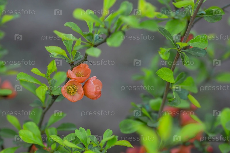 Оранжевые японские цветы айвы. Апельсиновые японские цветы весной. Большие цветы и почки оранжевой японской айвы на зеленом фоне. Копируйте пространство для текста