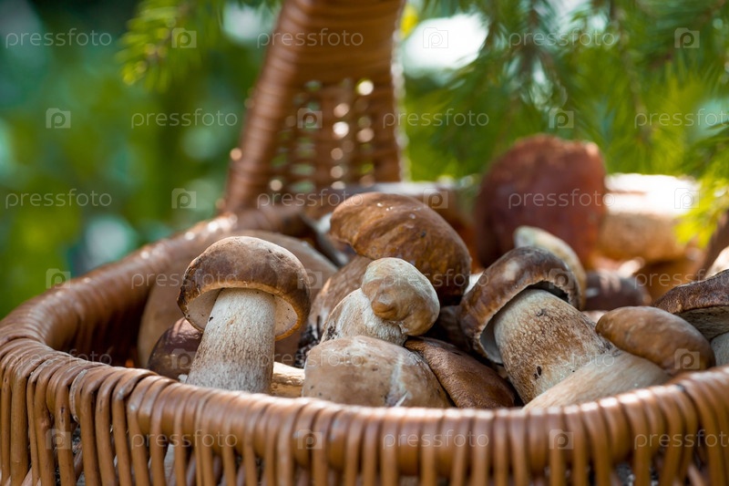 Благородный королевский гриб. Темно-белый или бронзовый болет. Болетус грибы в плетеной корзине в ельном лесу. Красивая текстура природного фона