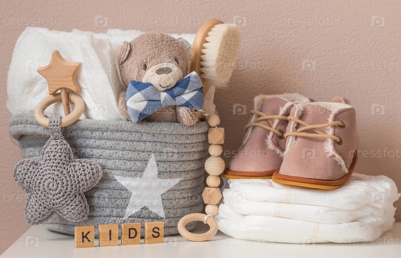 Деревянные игрушки, стопка подгузников и детские принадлежности на сменный стол. Копируйте пространство для текста