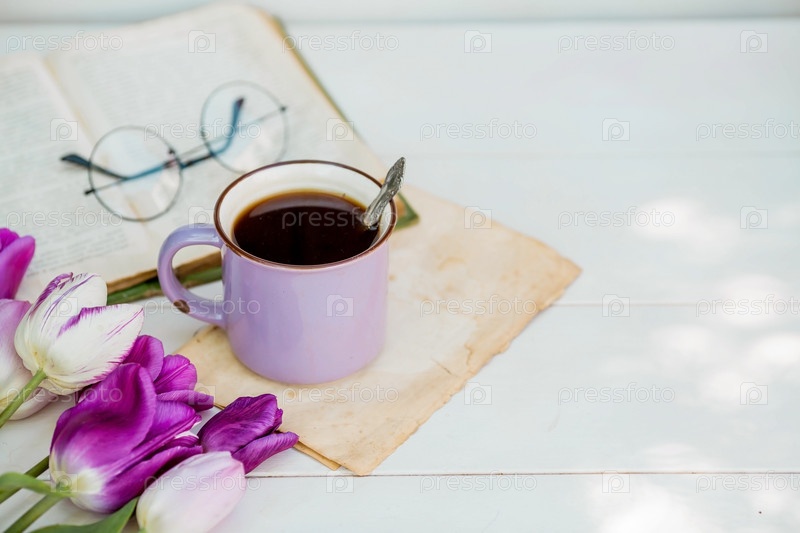 Натюрморт в винтажном стиле. Причудливая фиолетовая кофейная кружка, старая книга, тюльпаны и стаканы на деревянном столе