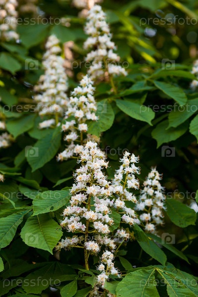 Каштановые ветви и цветы с солнечными лучами на закате. Весной цветущее дерево. Близко