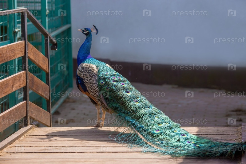 Портрет красивого индийского или голубого павлина с перьями. Красивый птичий хвост. Красивый представительный экземпляр самца в великолепных металлических цветах