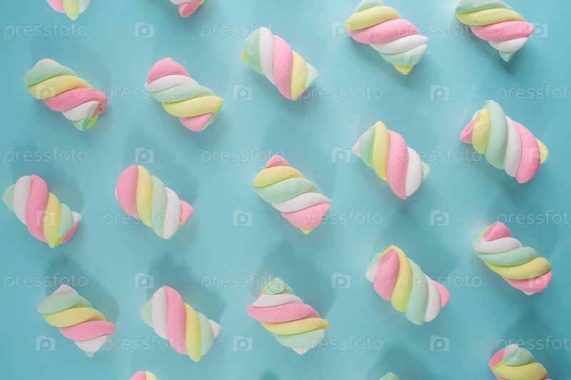 Маршаллоу. Сухой конфетный крупный план на бирюзовом фоне. Десерт сладкой еды. Пастельные цвета. Копия текстового пространства