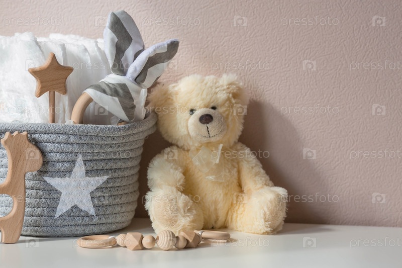 Деревянные игрушки, стопка подгузников и детские принадлежности на сменный стол. Копируйте пространство для текста