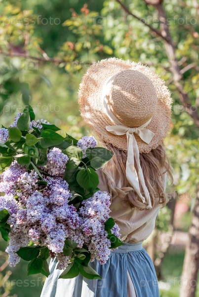 Винтаж. Красивая молодая женщина в ретро-одежде, соломенной шляпе и с букетом сирен в цветущем саду. В стиле Бохо. Визуальный для контента
