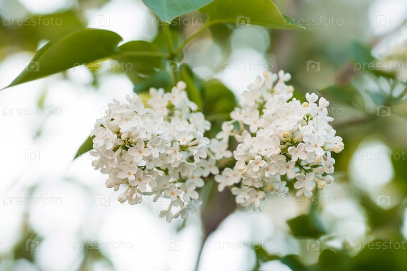Знамя. Нежный белый сиреневый цветет в парке. Цветы на закате. Свет от солнца. Близко. Красивый боке на заднем плане