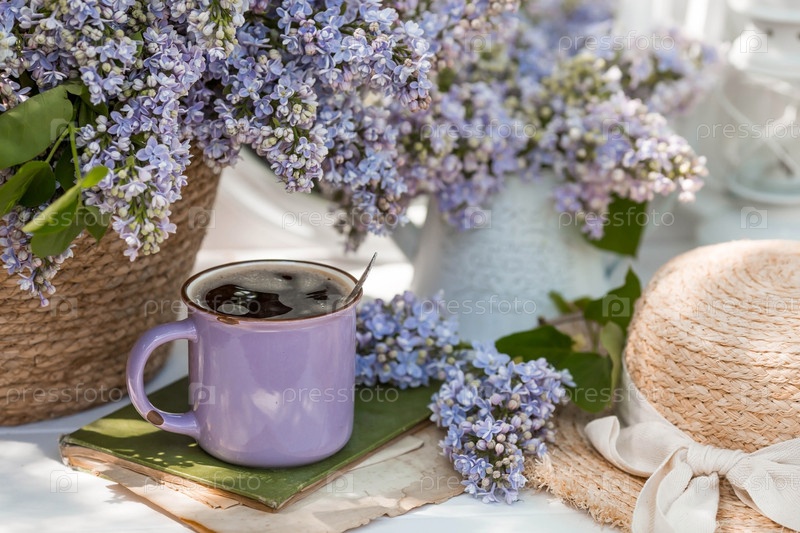 Открытка очень красивая. Причудливая фиолетовая кофейная кружка, старая книга и букет фиолетового сирени. Прекрасная натюрморт. Весеннее время. Концепция «Доброе утро»