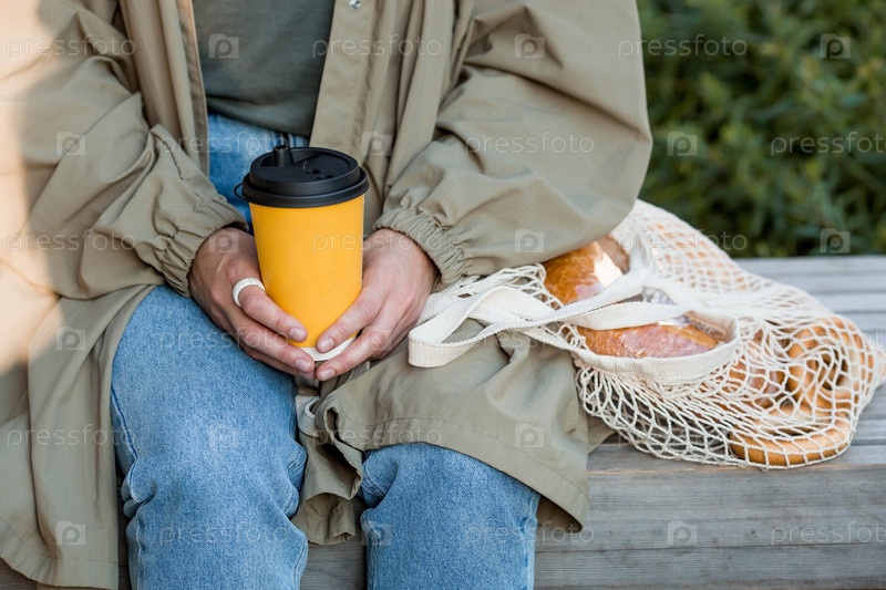 Современная стильная женщина с бумажной чашкой горячего кофе в руках и струнной сумкой со свежим хлебом на скамейке. Концепция уличной еды и экологии. Отказ от пластиковых пакетов