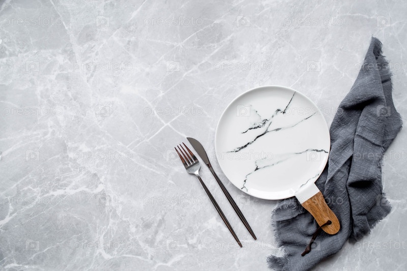 Знамя. Пустая керамическая мраморная плита с деревянной ручкой, вилкой, ножом и полотенцем на фоне серого бетонного стола. Пространство для текста. Концепция меню для кафе и ресторанов