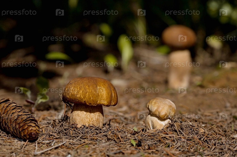 Благородный королевский гриб. Темно-белый или бронзовый болет. Гриб Болетус в ельном лесу. Красивая текстура природного фона