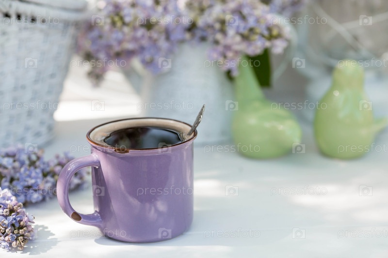 Открытка очень красивая. Причудливая фиолетовая кофейная кружка, старая книга и букет фиолетового сирени. Прекрасная натюрморт. Весеннее время. Концепция «Доброе утро»