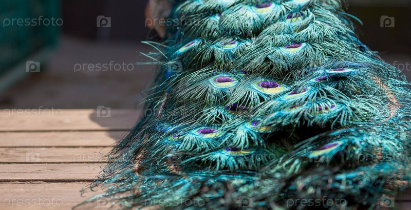 Красивая текстура павлиньих перьев крупным планом. Абстрактный красочный фон птичьего хвоста