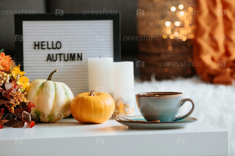 Уютная осенняя концепция. Домашнее тепло в холодную погоду. Натюрморт. Одеяло, тыквы, цветы и чашка чая на кофейном столике в интерьере гостиной