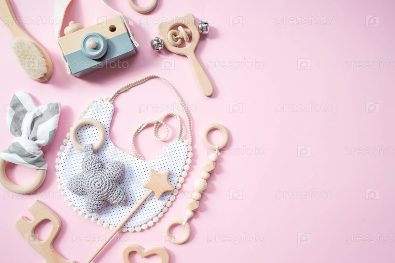 Биб и деревянные игрушки. Набор детских вещей и аксессуаров для девушки на пастельно-розовом фоне. Модный новорожденный. Плоский лед, вид сверху