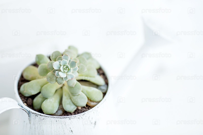Группа миниатюрных сочных цветов в белом винтажном поливе. Закрытие зеленых кончиков Эчеверии. Цветущие домашние растения. Суккуленты