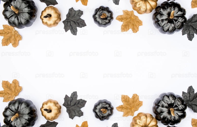 Знамя. Современный фон с летучими мышами, черными и золотыми тыквами, листьями, паутиной, пауками на белом фоне. Хэллоуин с копией для текста. Плоский лед, сверху