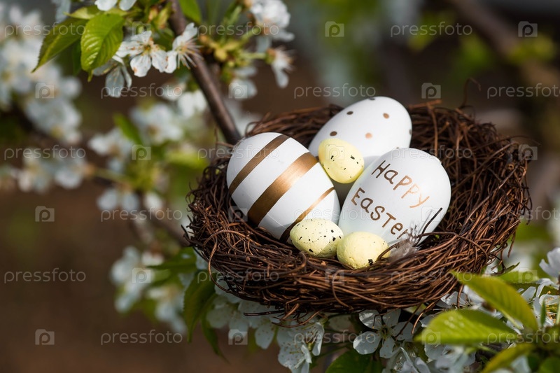 Счастливой Пасхи 2022. Открытка с копией места для текста. Белые и золотые яйца в птичьем гнезде на естественном фоне вишневых цветов