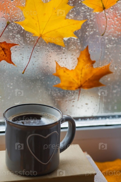 Осенний натюрморт с красивым боке. За окном кленовые листья и капли дождя бегут по стеклу. Чашка горячего чая, книги и вязаное одеяло у окна