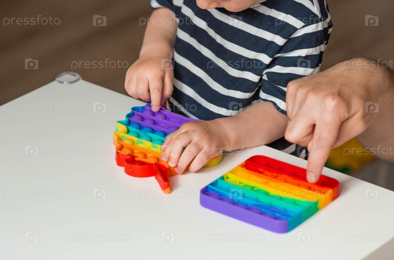 Ребенок с красочной поп-игрой. Антистресс. Снимок крупным планом детских рук, играющих с популярной поп-музыкой Это игрушка